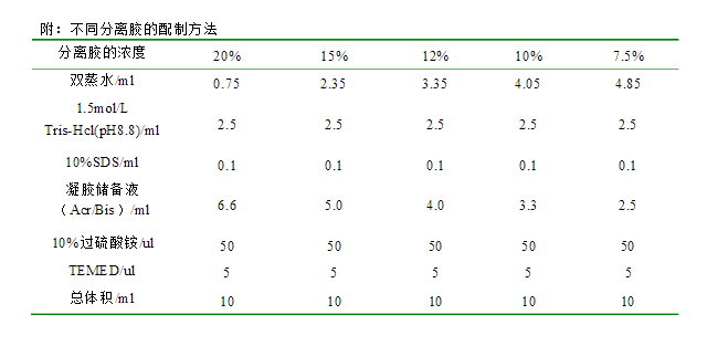 按上表各液加入混勻后配制成分離膠后,將凝膠液沿凝膠腔的長玻璃板的內面緩緩用滴管滴入,小心不要產生氣泡。將膠液加到距短玻璃板上沿2cm處為止,約5mL。然后用細滴管或注射器仔細注入少量水,約0.5-1mL。室溫放置聚合30-40min。 #p#分頁標題#e#