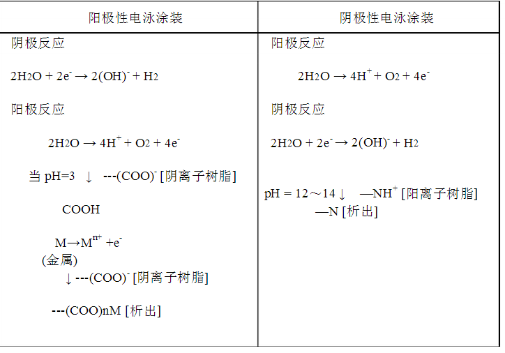 ●電滲:沉積的電泳涂膜收縮、脫去溶劑和水,形成均勻致密的濕膜 電極附近主要的化學(xué)反應(yīng)如下表所示: