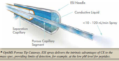 CE與其極性和帶電荷的分析物,如代謝物,堿性藥物和肽一起工作。其分離完全蛋白,高度帶電的肽和非常難以解析的蛋白復(fù)合物的能力將提供LC-MS不容易實現(xiàn)的新信息。傳統(tǒng)上,CE-MS已經(jīng)使用同軸噴霧器進行,其添加鞘液和霧化氣體以實現(xiàn)穩(wěn)定的ESI噴霧。這種同軸的“三管噴霧器”設(shè)計,雖然功能,導(dǎo)致樣品稀釋和信號減少。Beckman Coulter的新型CESI 8000高性能分離-ESI模塊與OptiMS技術(shù)提供了**商業(yè)無護套CE-MS噴霧器,為研究人員提供了一個強大的高靈敏度接口,利用高效,低流速的CE分離。